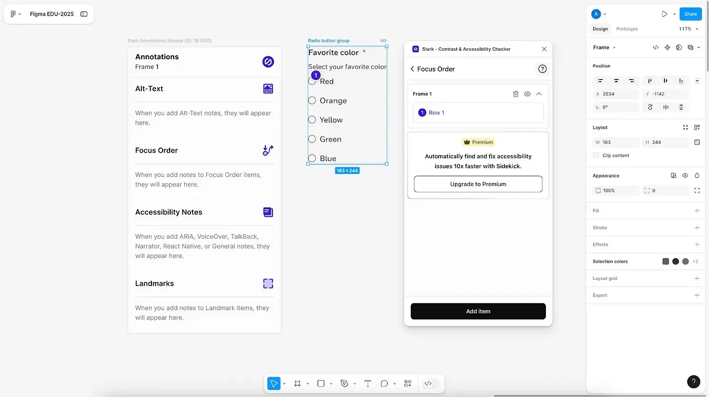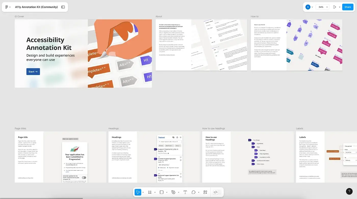 - A11Y Annotation Kit: Бесплатный файл сообщества Figma, предлагающий компоненты пользовательского интерфейса для разметки дизайна с предлагаемым названием страницы, заголовками, ориентирами и т. д. Эти аннотации помогают разработчикам понять, какие действия им необходимо предпринять для реализации доступного дизайна.