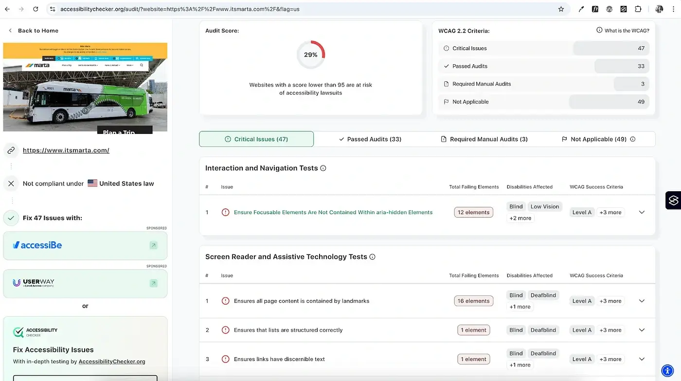 - Accessibility Checker: Еще один бесплатный инструмент, в который вы можете вставить свой сайт для проверки, после чего он просканирует его и отметит недостатки доступности. Он даст вам оценку аудита, чтобы вы могли отследить улучшение показателей по мере устранения проблем, а также дает рекомендации по решению каждой проблемы.