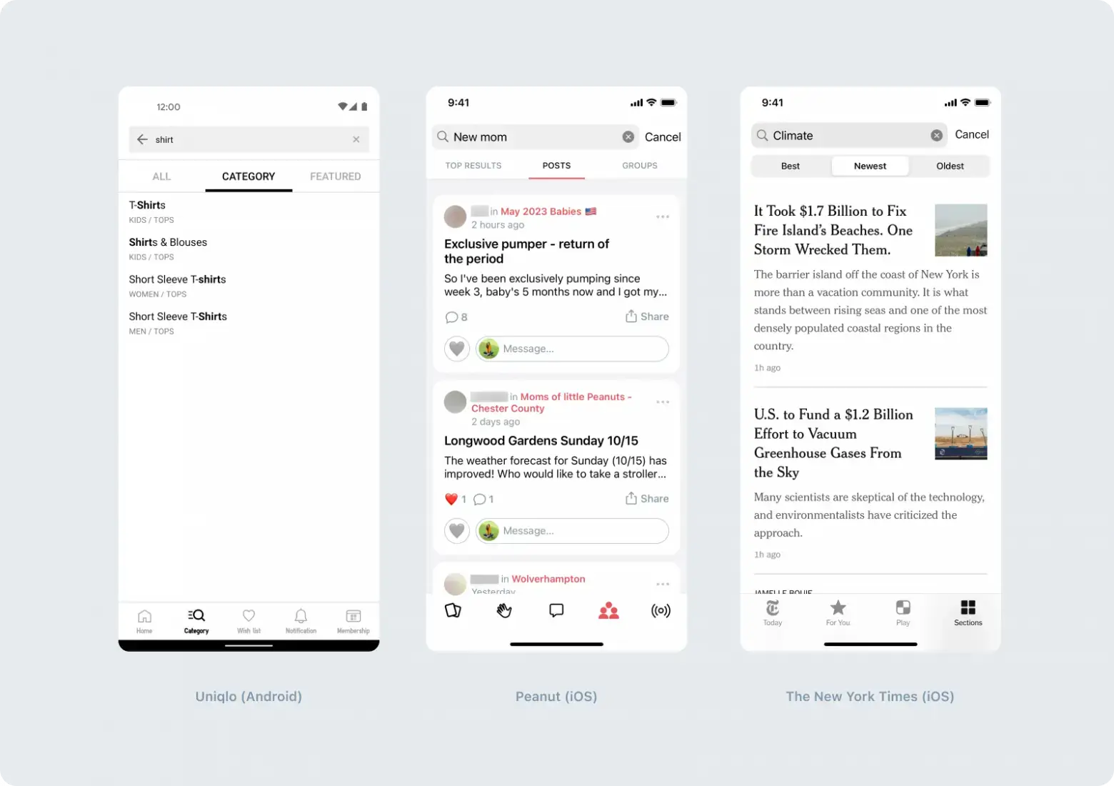 Если в вашем приложении много контента разного типа, стоит рассмотреть возможность добавления категорий, фильтров, либо их комбинации. Они обеспечивают более структурированный подход к организации результатов.