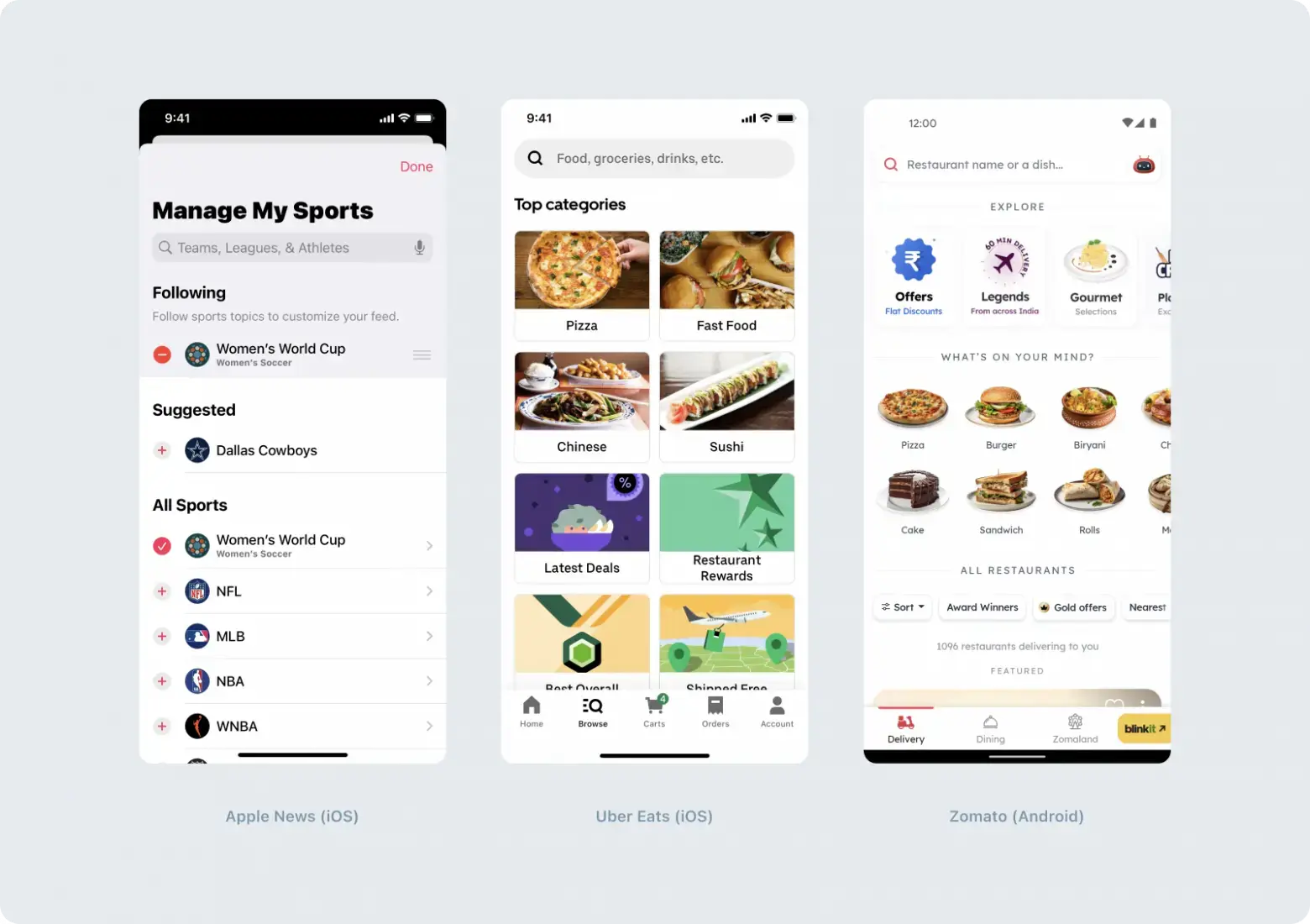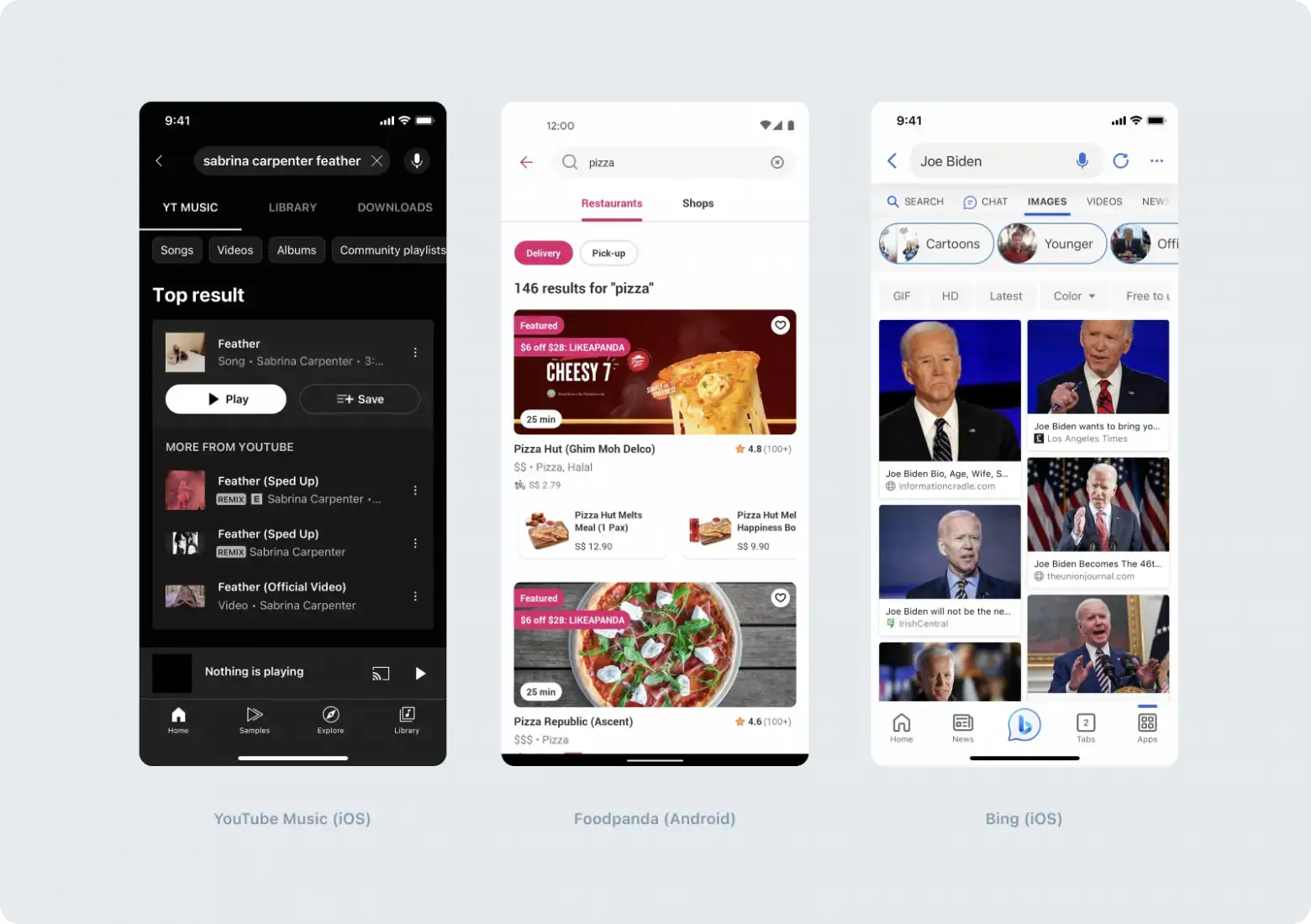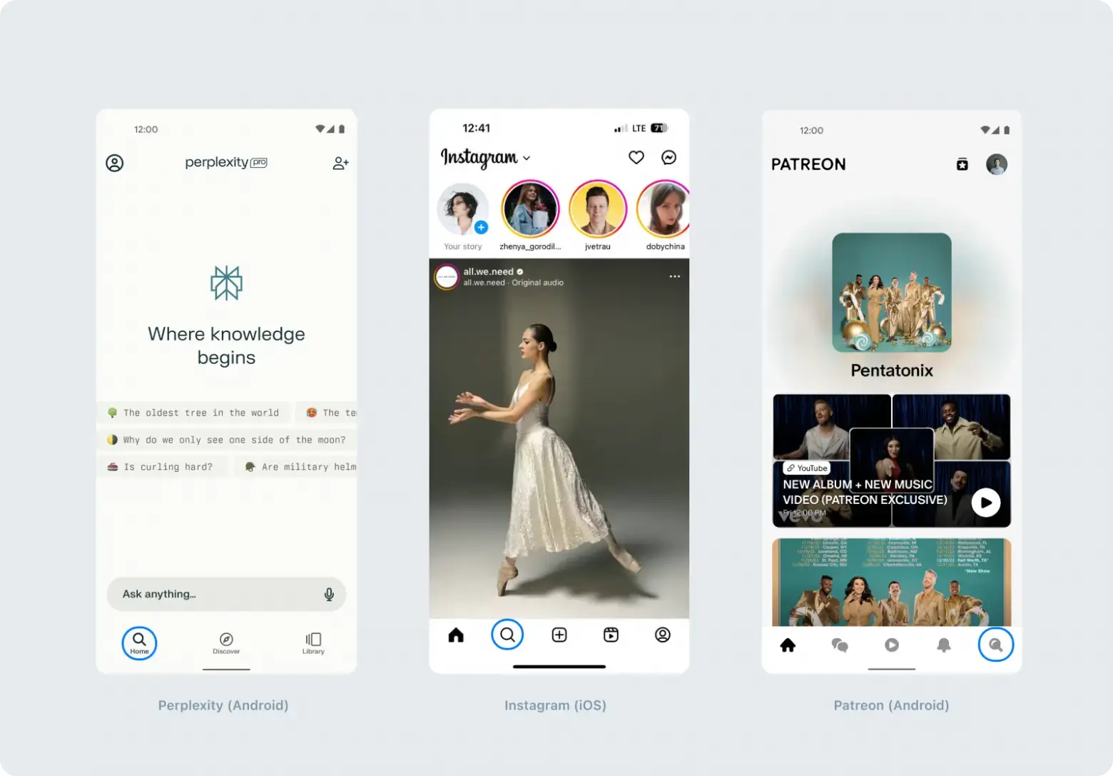 Размещение иконки поиска в Tab bar (Human Interface) или Navigation bar (Material guidelines) обеспечивает доступ к функции поиска с любого экрана приложения. Этот вариант подходит для приложений, где поиск играет важную роль в общей навигации и пользователи могут быстро перейти к поиску независимо от текущего контекста. Такой подход делает функцию поиска более универсальной и легкодоступной. Встретить его можно в таких приложениях, как Instagram, Uber Eats, Apple TV.