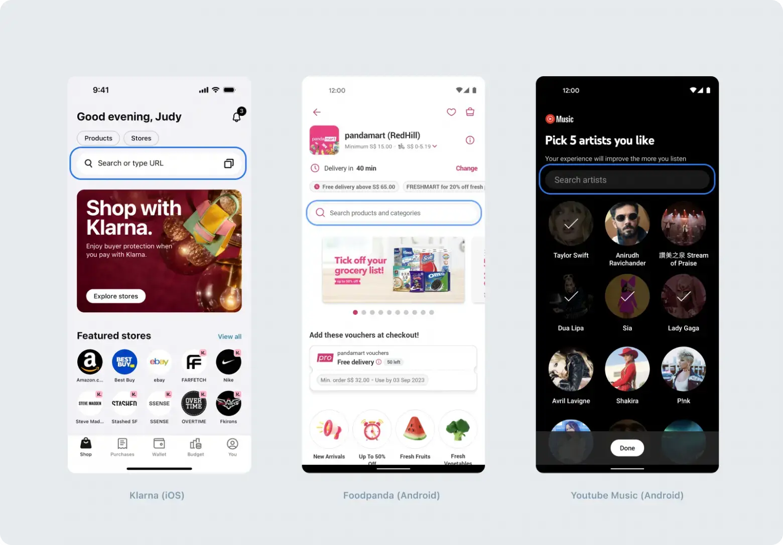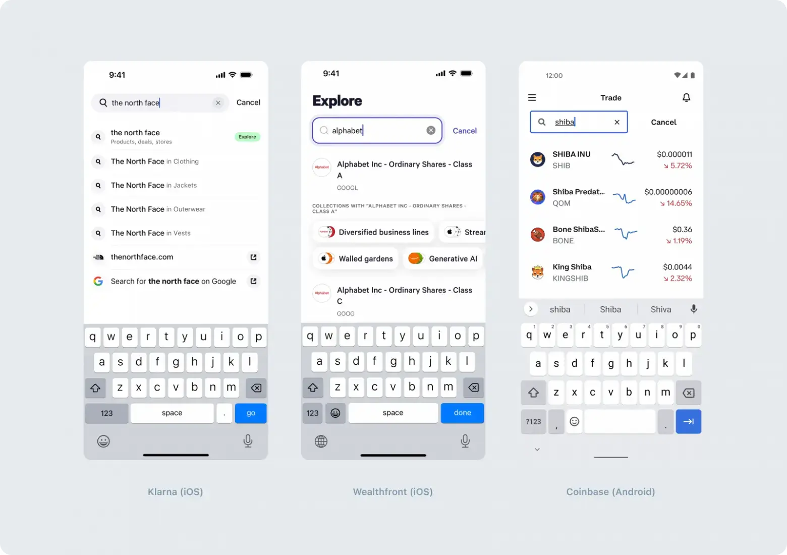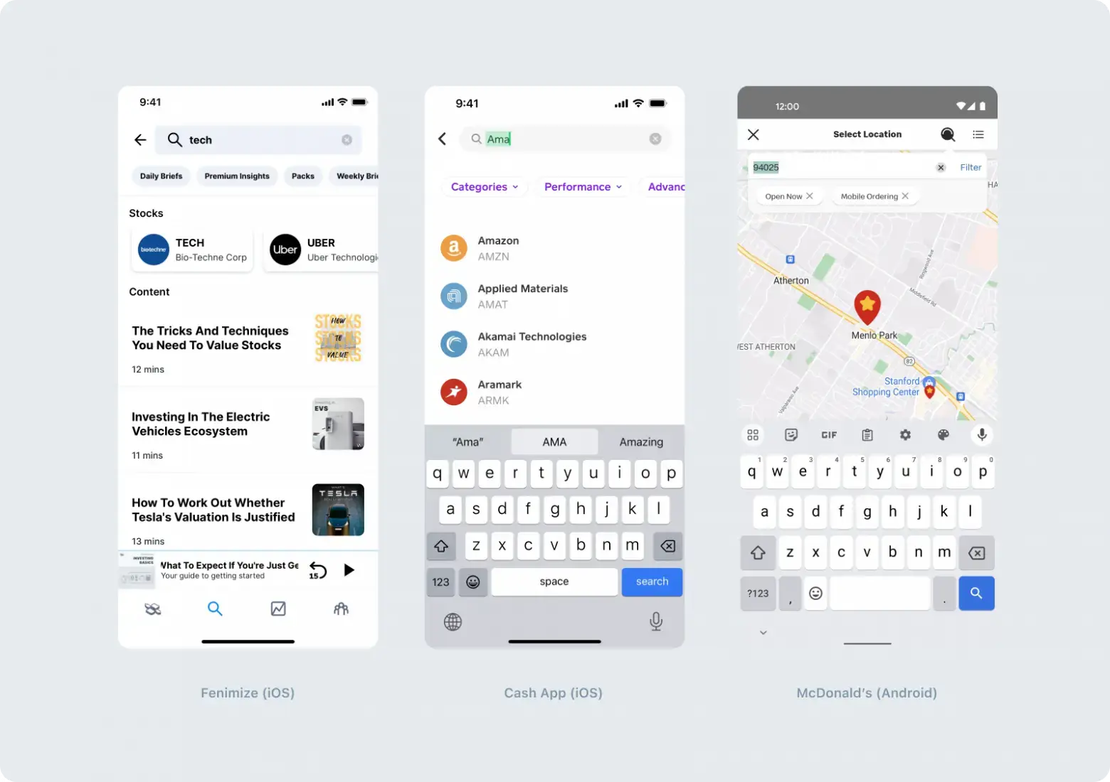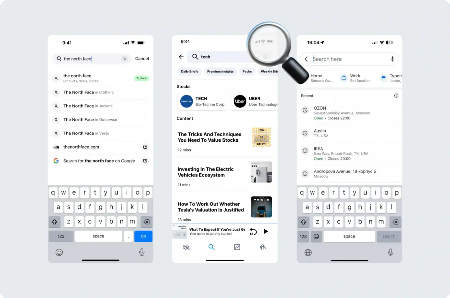 В статье Suzanne Scacca для Smashing Magazine хорошо расписаны варианты точек входа. Suzanne отмечает, что поиск может быть размещен снизу и сверху экрана. Мы хотим дополнить — на момент 2024 года поисковая строка может появляться не только сверху или внизу, в некоторых случаях она может быть расположена внутри экрана.