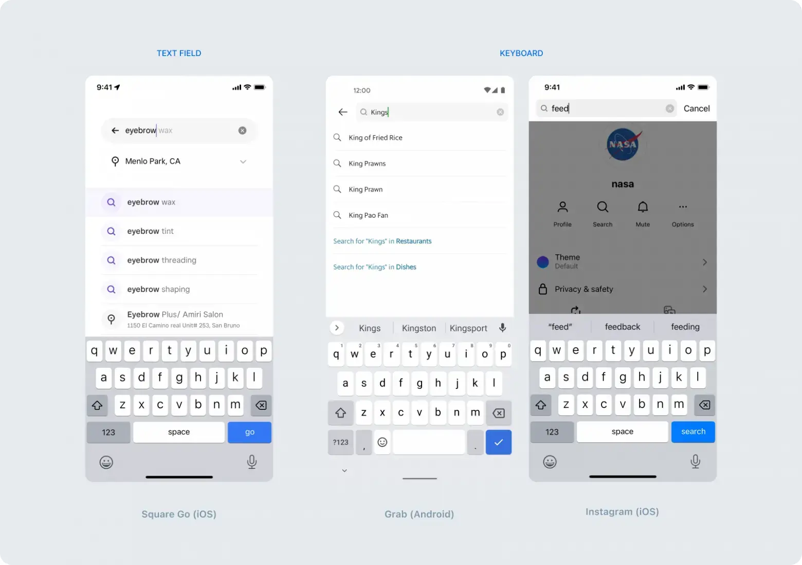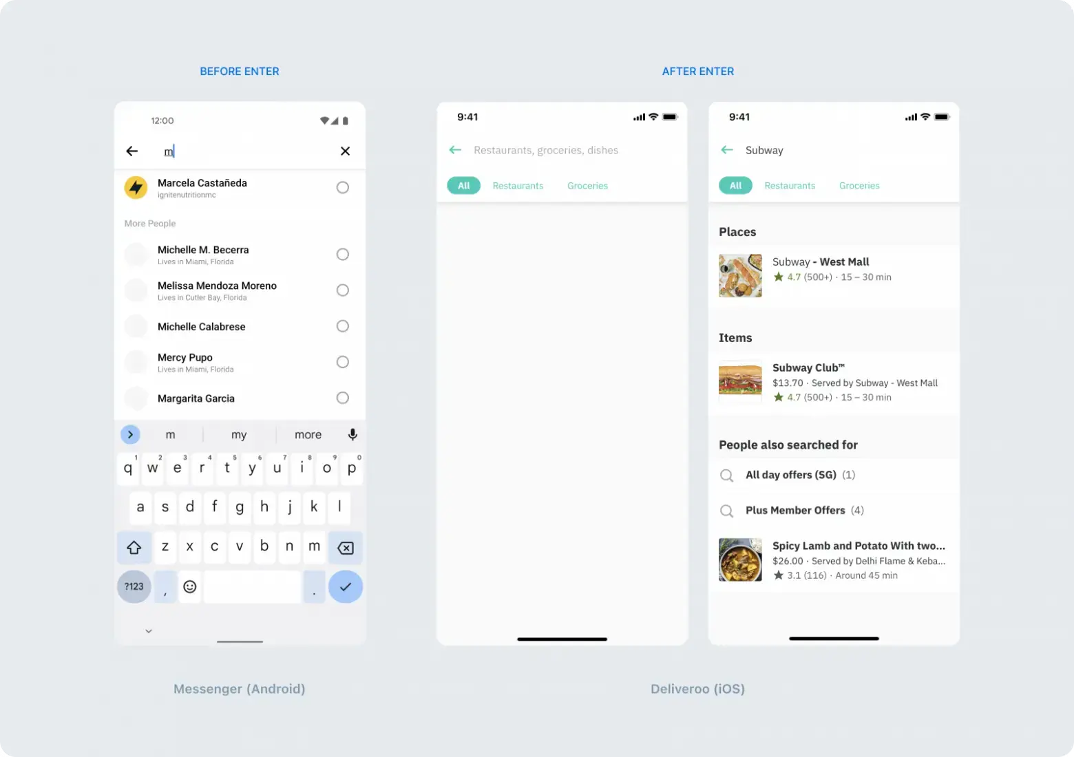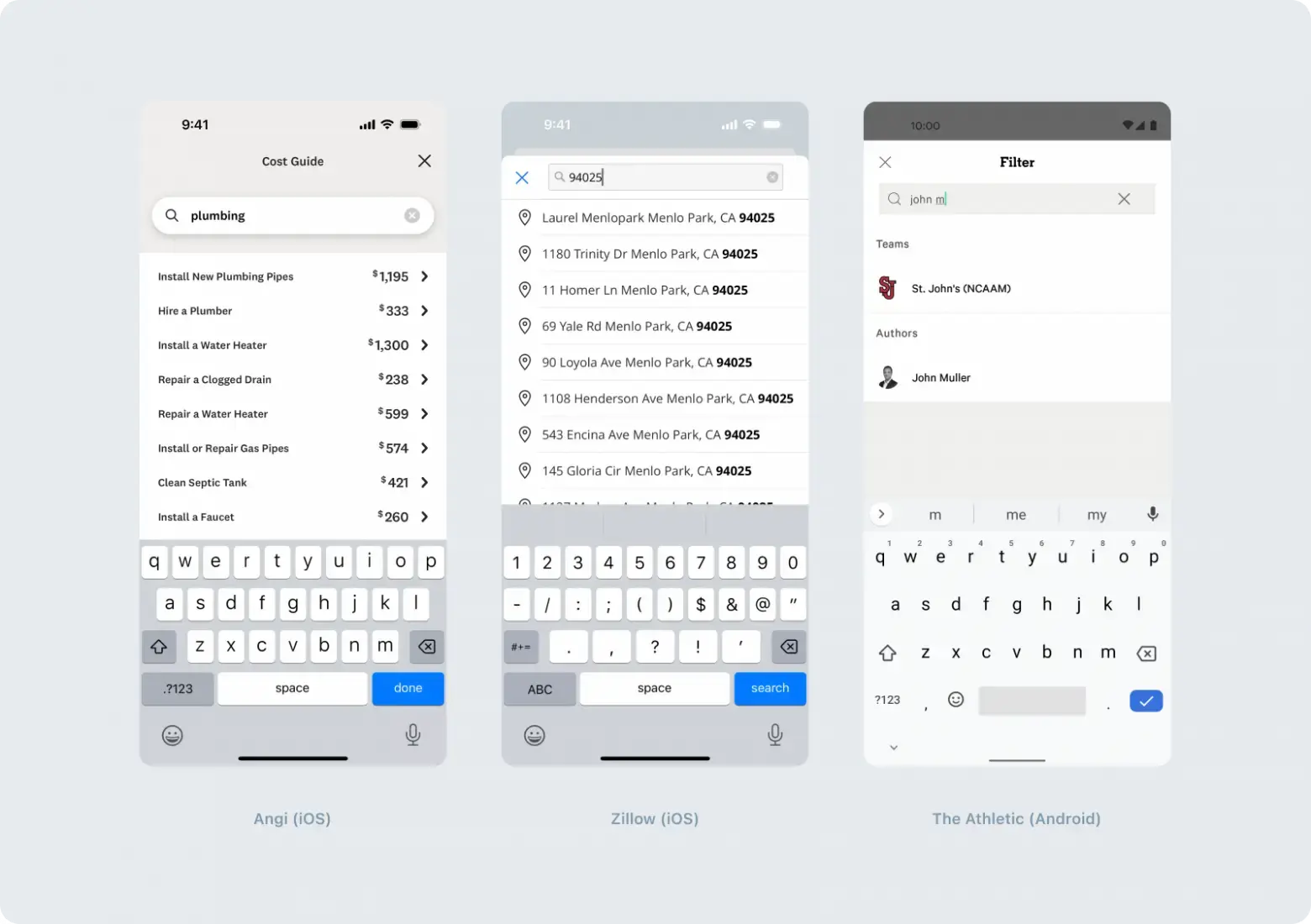 Хорошо спроектированные мобильные интерфейсы следуют основному принципу удобства использования: уважайте усилия пользователя. Сохраненные, недавние и популярные запросы делают это, облегчая выбор из предыдущих поисков вместо повторного ввода тех же ключевых слов или критериев поиска.