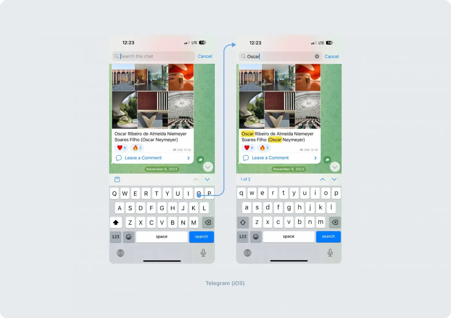 Если поиск открывается на том же экране, то вероятнее всего он нужен для поиска по контенту данного экрана и работает как фильтр. Пример такого фильтр-поиска есть в Telegram. Активировать поиск внутри канала можно из выпадающего меню. При клике на поиск в навбаре появляется поисковая строка, которая фильтрует контент.