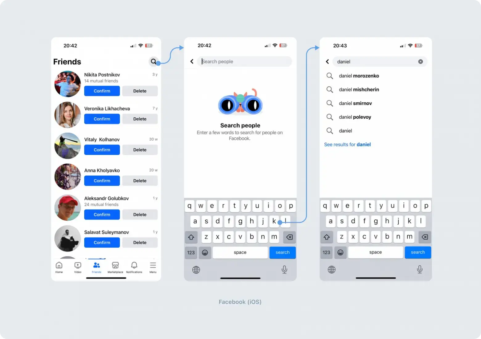 Пример локального поиска можно найти в приложении Facebook в разделе Друзья. Тут точка входа в поиск обозначена с помощью иконки лупы. Кликнув на эту иконку, пользователь начинает поиск по списку людей. При этом данный поиск будет происходить только по списку людей, иными словами — локально.
