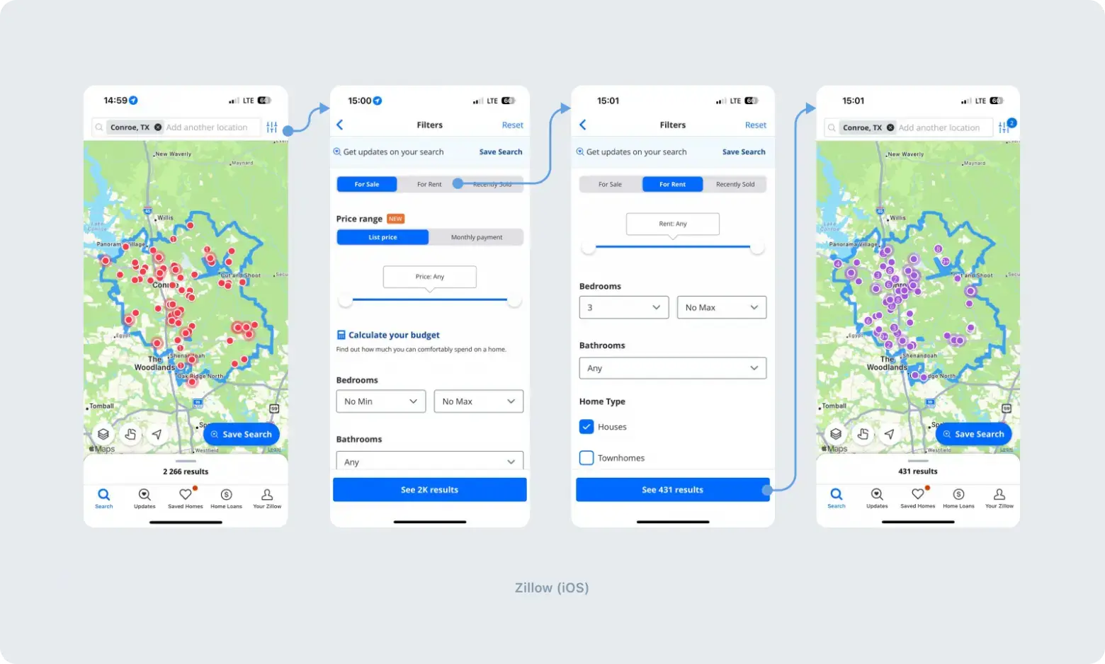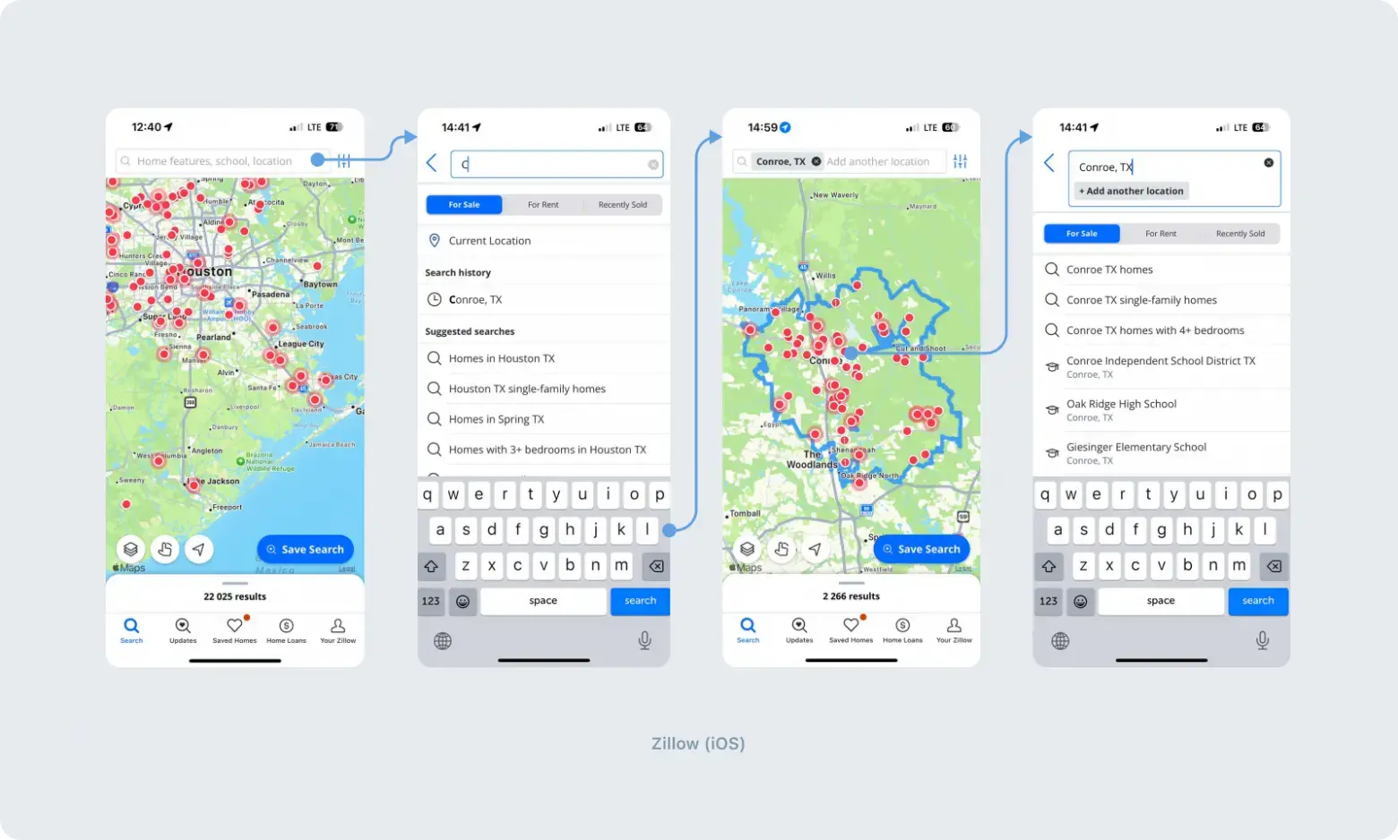 Мультипоиск предоставляет пользователю возможность обрабатывать несколько поисковых запросов одновременно. Примером такого подхода может служить приложение Zillow, которое позволяет пользователям искать недвижимость в нескольких районах одновременно. После выбора района он автоматически добавляется в поле поиска в виде тега. При необходимости пользователь может добавить еще один тег, добавляющий еще один район.