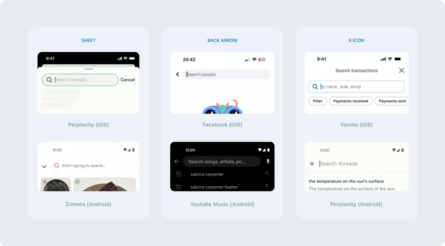 Чаще всего поиск открывается на отдельном экране, который фокусирует пользователя на своем поисковом запросе. Отдельно отметим, что этот экран может быть как полноценным экраном, так и модальным. Визуально отличатся они будут прежде всего точкой выхода из сценария поиска: