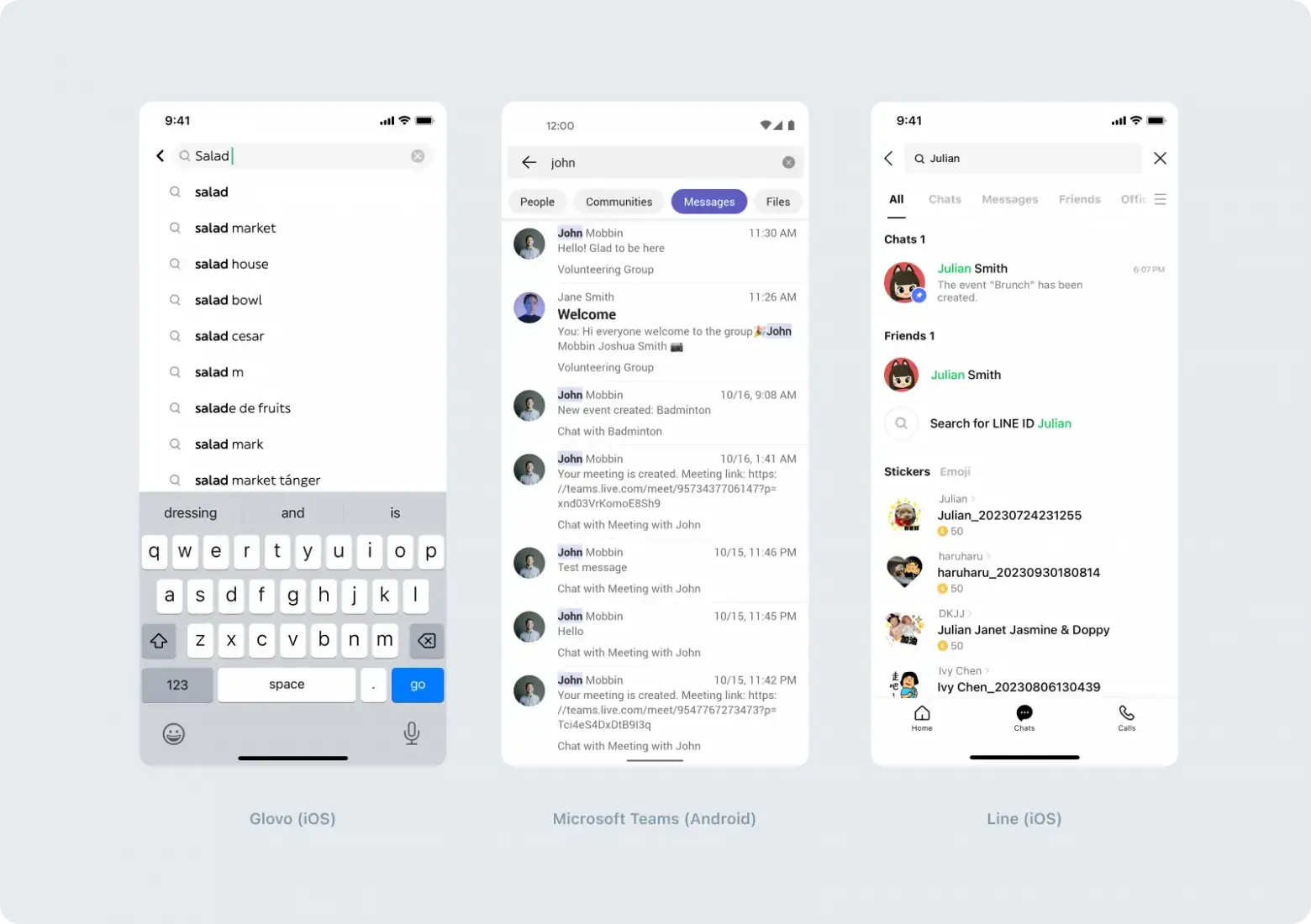 Глобальный поиск нужен в приложениях с большим количеством контента и служит одним из способов навигации. Он не ограничен каким-то одним типом контента, если только им не ограничено само приложение.