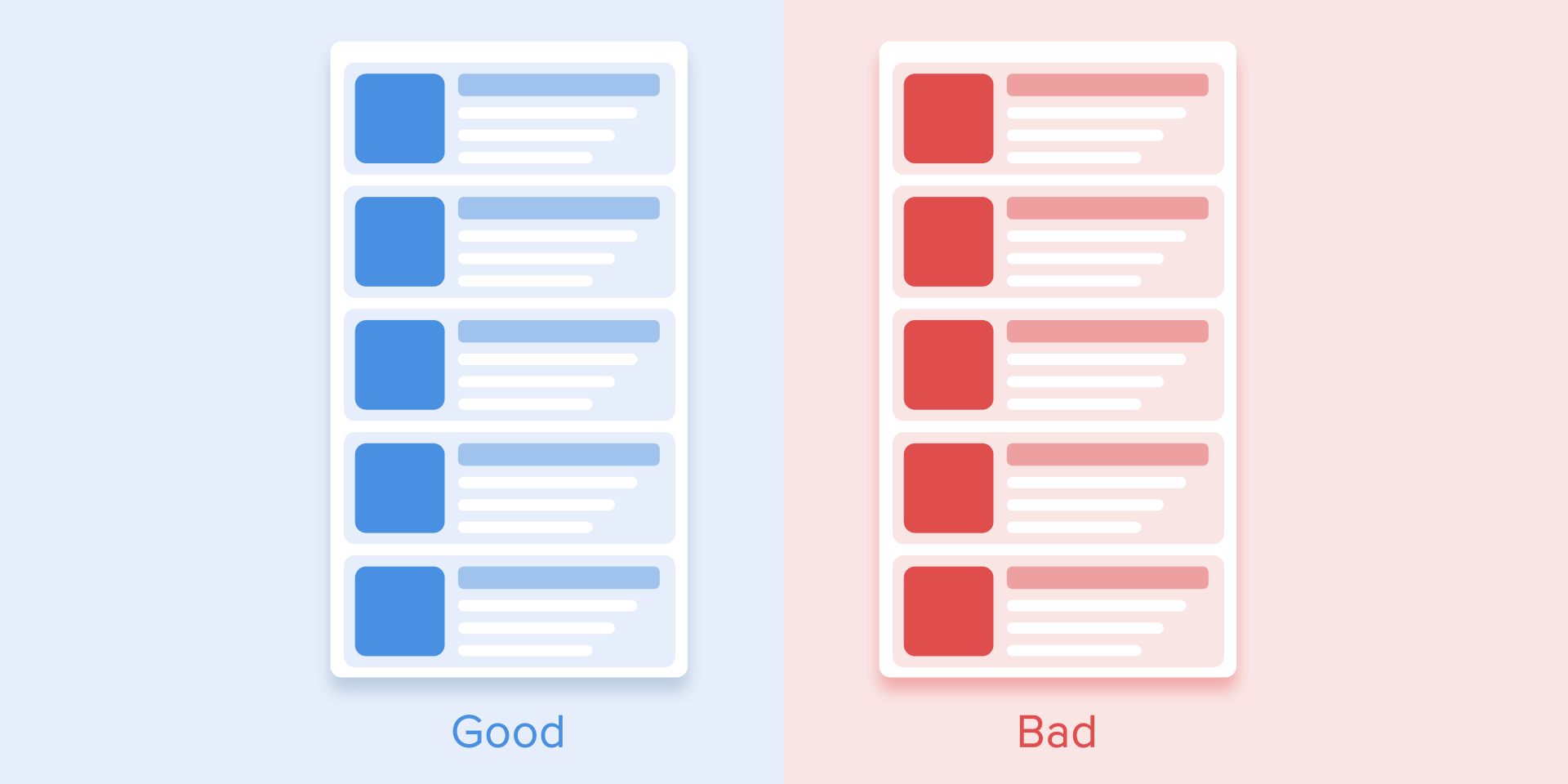 Элементы списка (карточки новостей, списки электронной почты и т.д.) должны иметь очень короткую задержку между своими появлениями. Каждое появление нового элемента должно длиться от 20 до 25 mс. Более медленное появление элементов может раздражать пользователя.