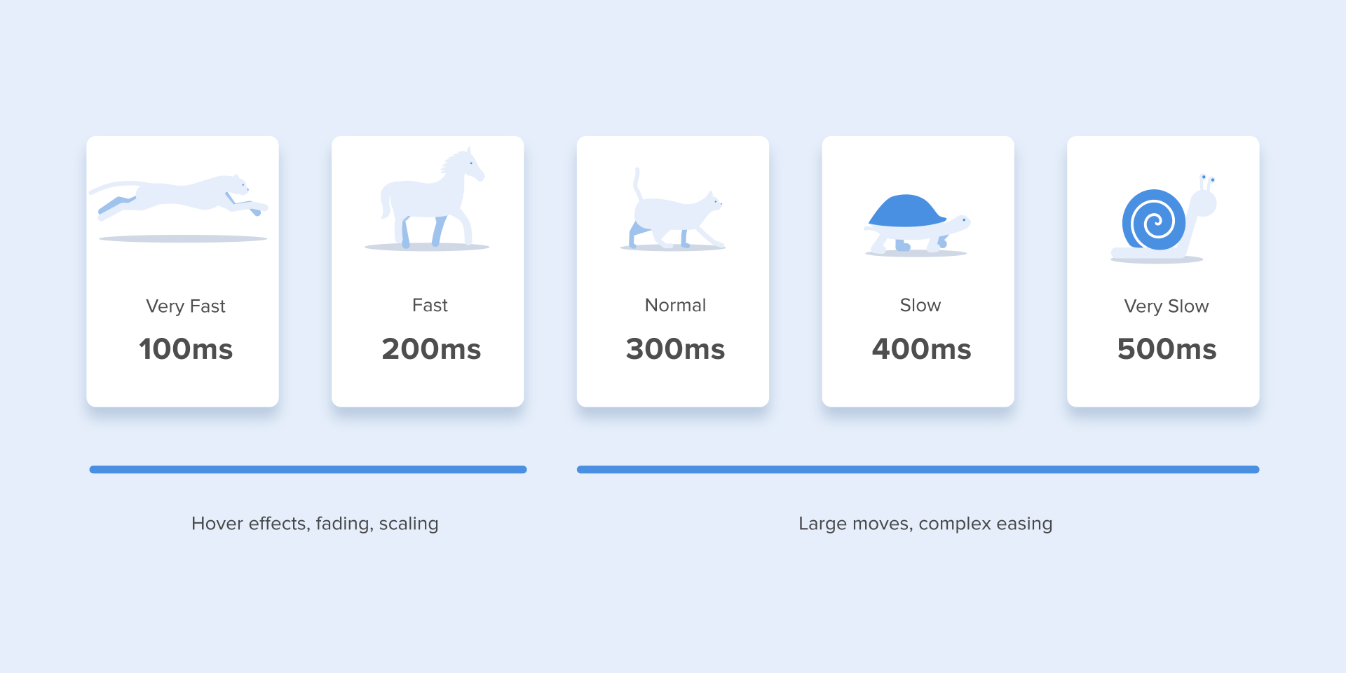 Многочисленные исследования показали, что оптимальная скорость анимации интерфейса составляет от 200 до 500 mс. Эти цифры основаны на особенностях человеческого мозга. Любая анимация короче 100 mс возникает мгновенно и не распознается вообще. В то время как анимация длительностью более 1 секунды будет вызывать ощущение задержки и, следовательно, будет скучна для пользователя.