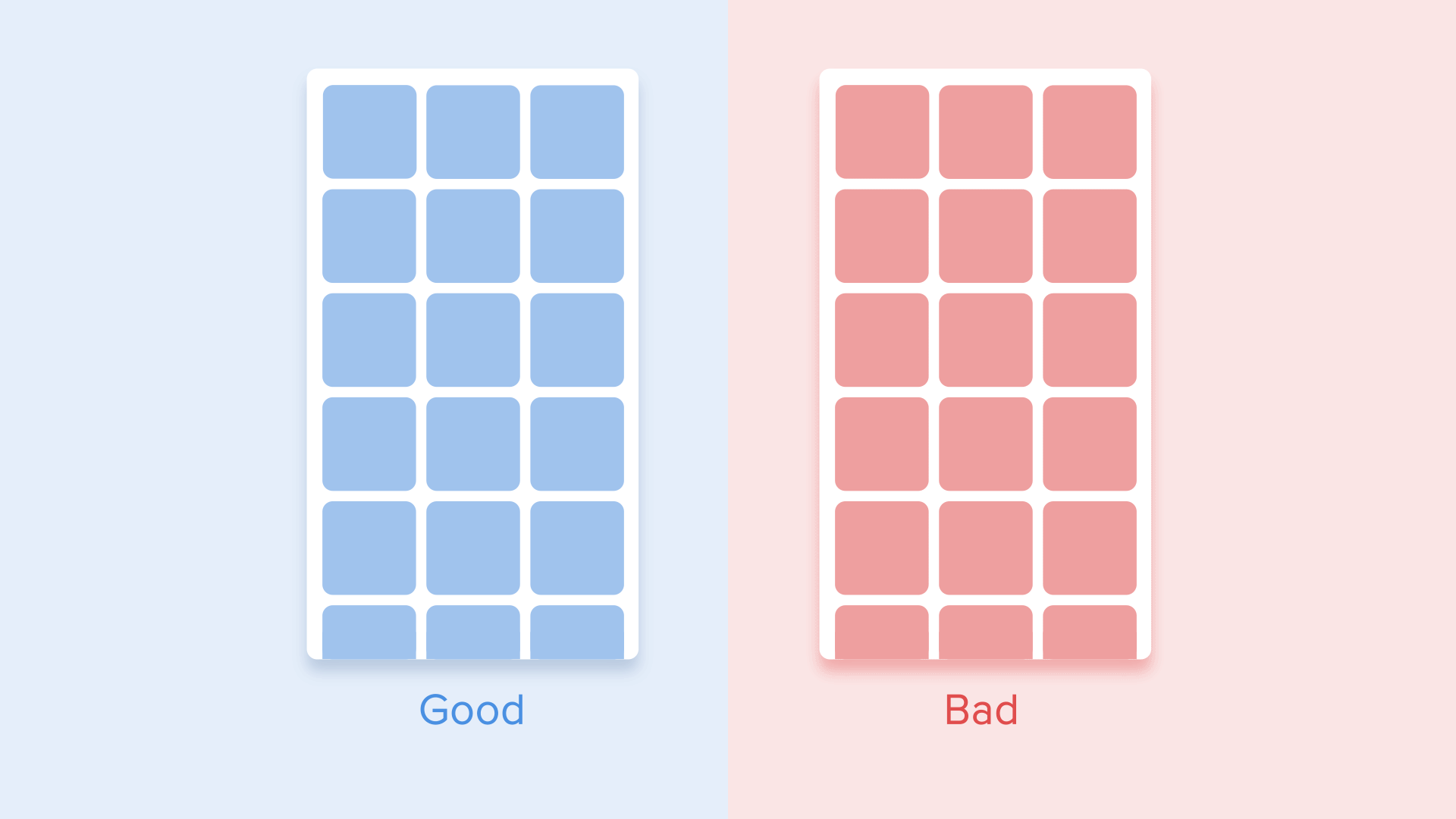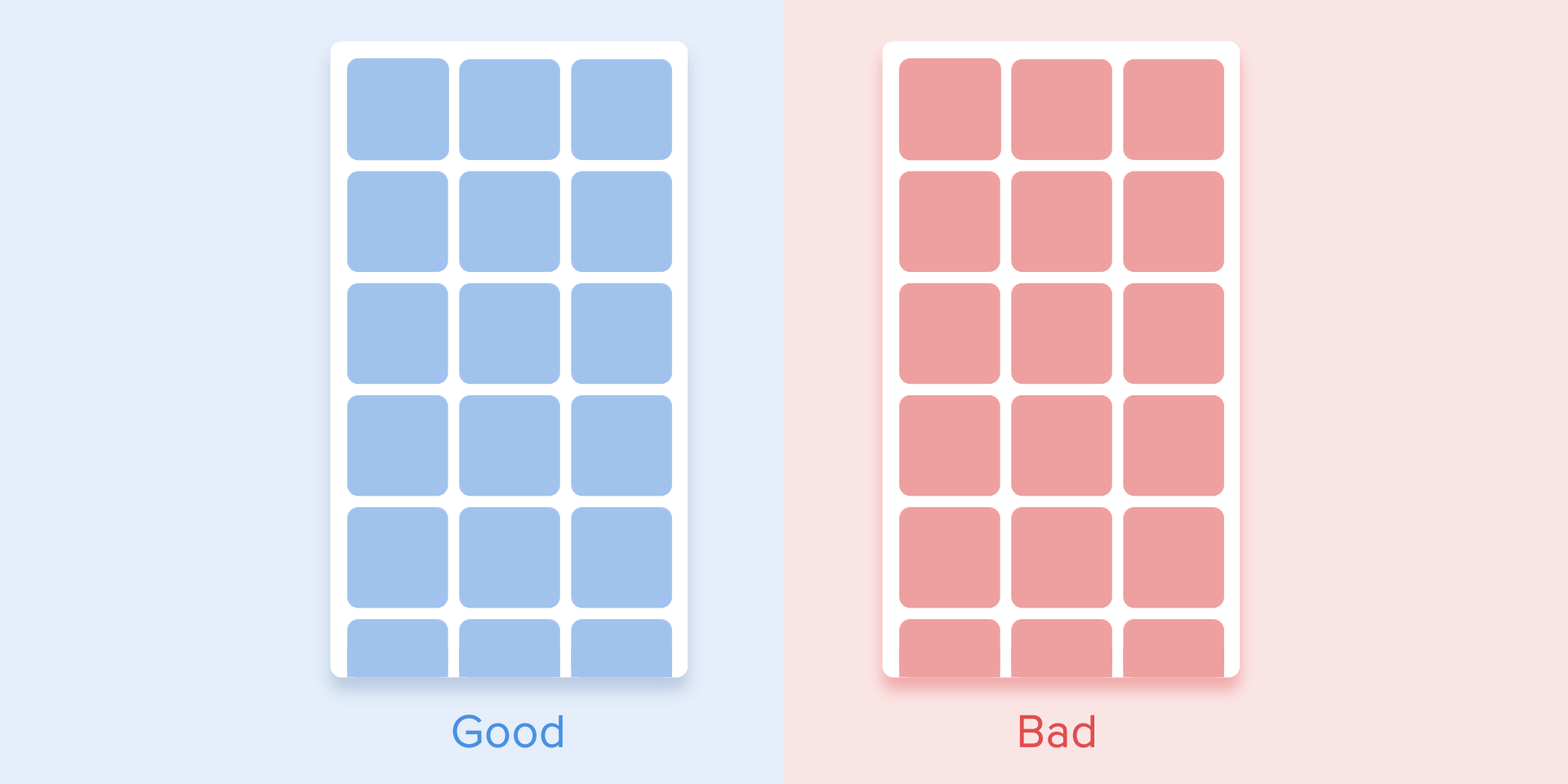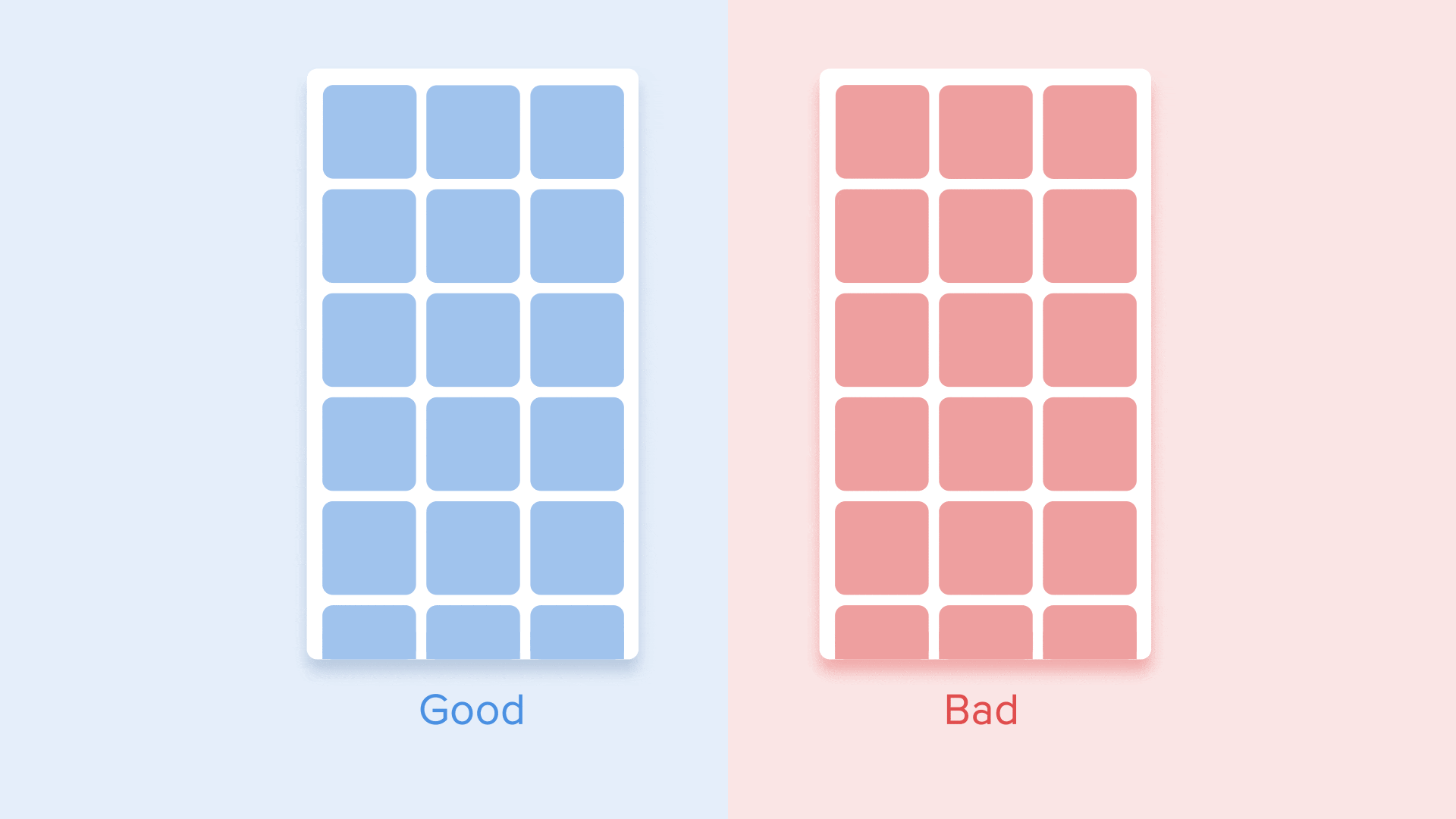 В этом случае появление всех карточек воспринимается как единый поток, который направляет внимание пользователя в одном направлении, а именно сверху вниз. Если не соблюдать порядок, внимание пользователя будет рассеиваться. Появление всех элементов сразу также будет выглядеть плохо.