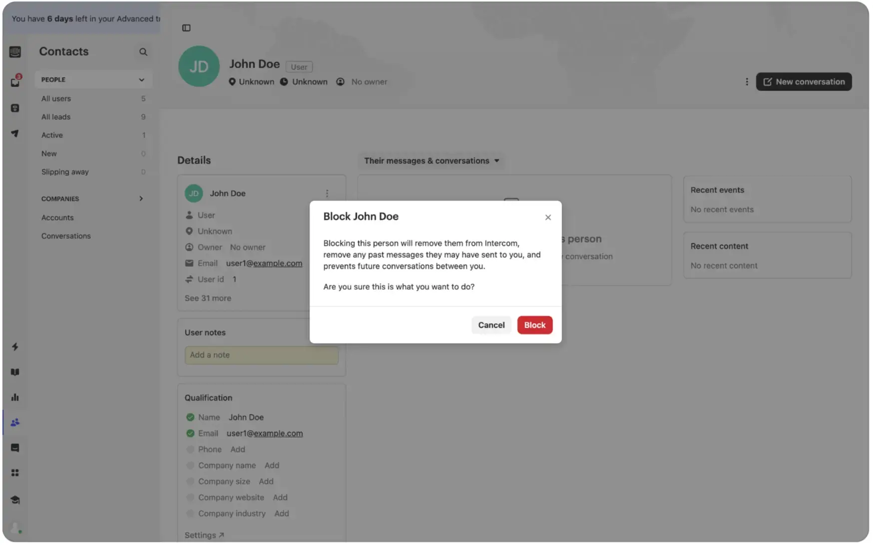 Intercom эффективно использует для предотвращения промахов запросы подтверждения. Например, опции «Архивировать» и «Блокировать», способные повлечь серьезные последствия, расположены близко друг к другу. Чтобы снизить риск выбора неправильного действия, сервис требует явного подтверждения намерения. Этот шаг не только играет роль страховки, но и дает возможность отменить случайное нажатие до того, как возникнут какие-либо нежелательные последствия.