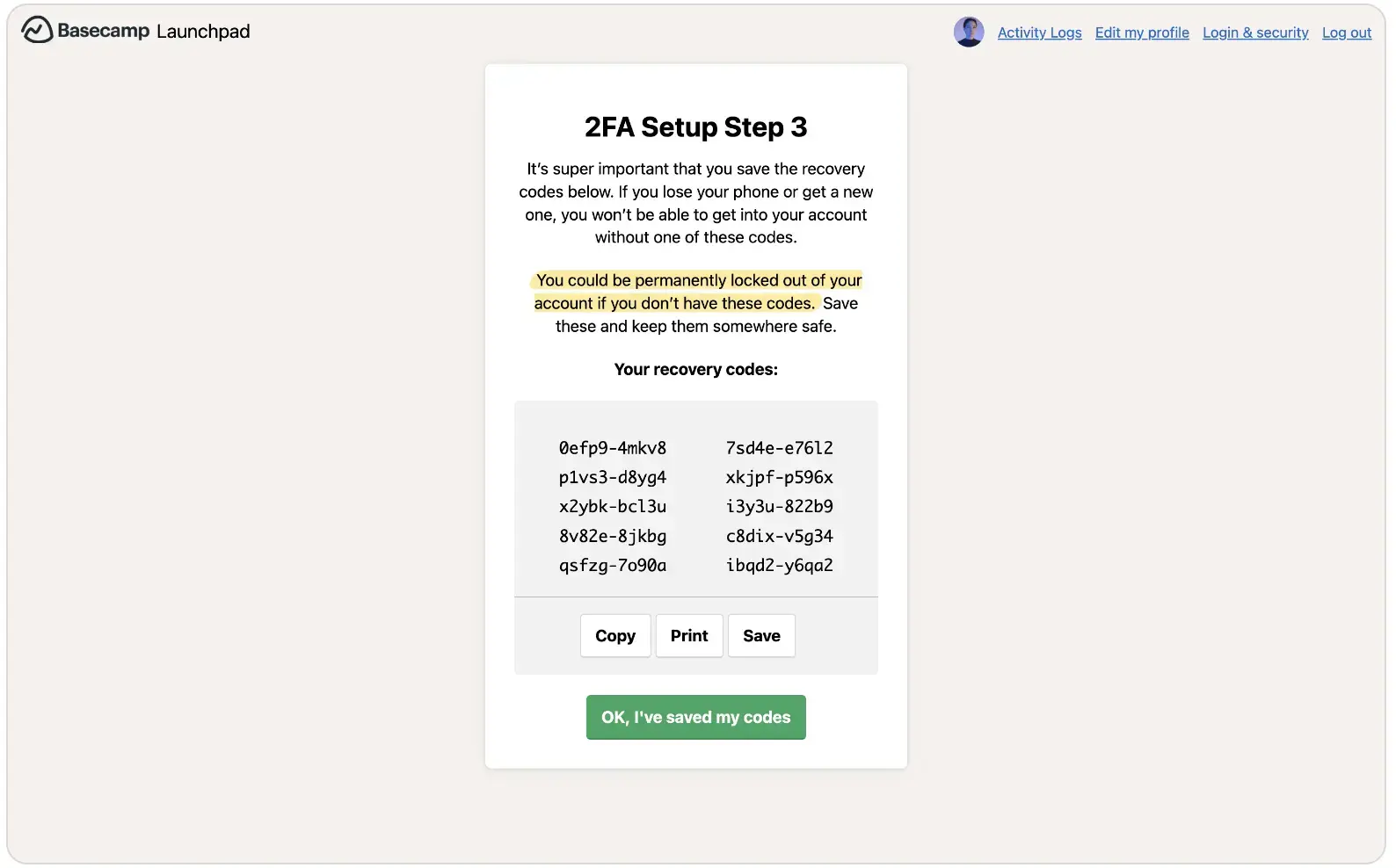 Отличный пример проактивного подхода — коды восстановления для двухфакторной аутентификации. Генерируя и предлагая пользователям сохранить эти коды, такие сервисы, как Basecamp, обеспечивают страховку на случай, если пользователь утратит доступ к своему аккаунту (например, потеряет или сменит телефон).
