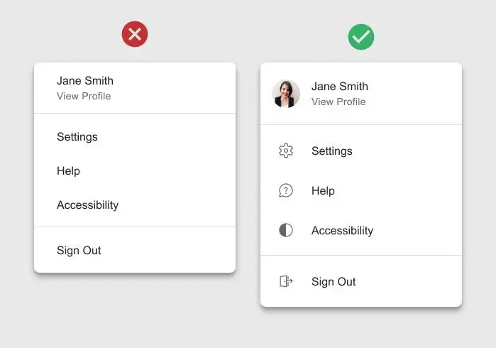 - Этот подход наиболее эффективен, когда в меню перечислены действия или категории, к которым легко подобрать узнаваемые визуальные подсказки.