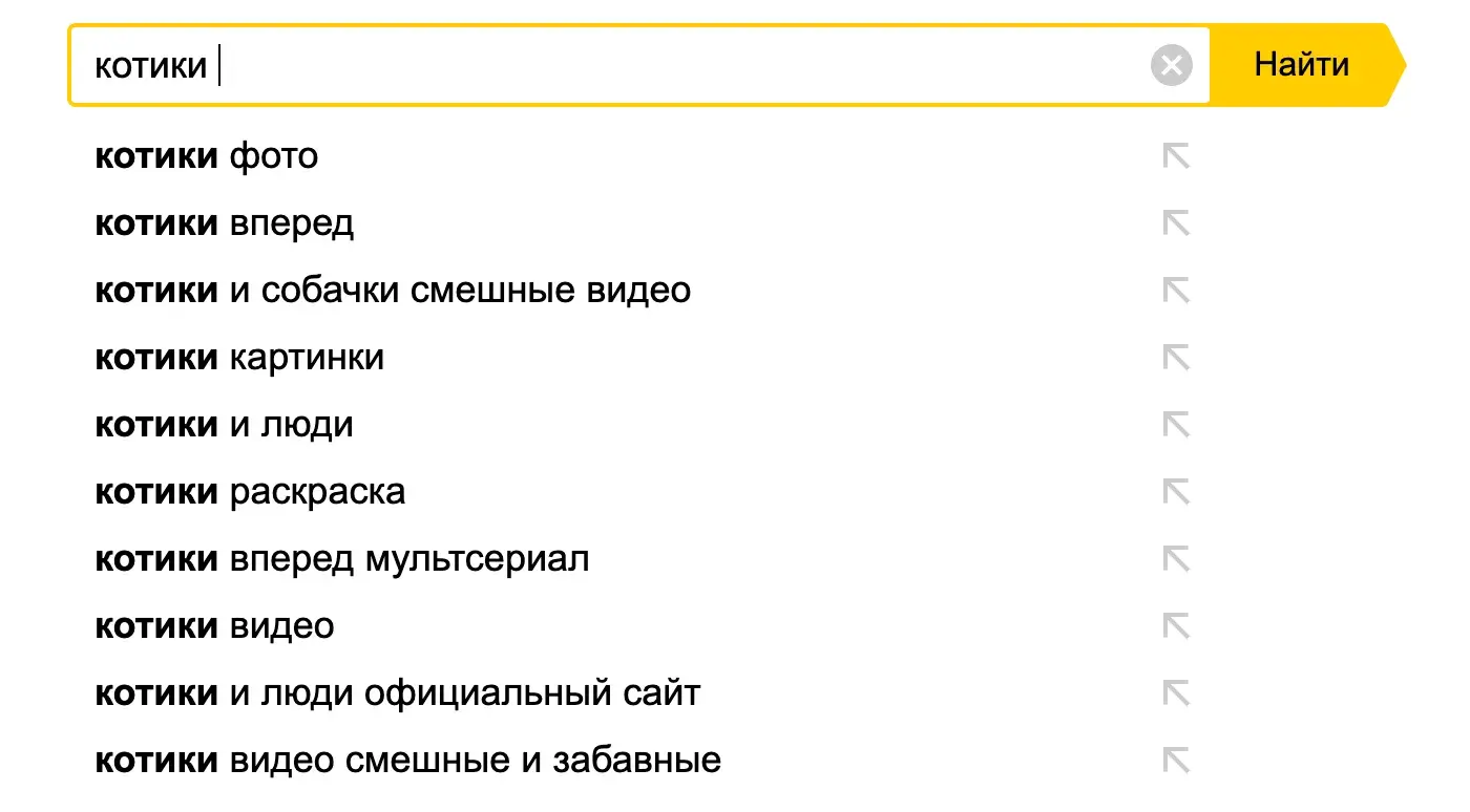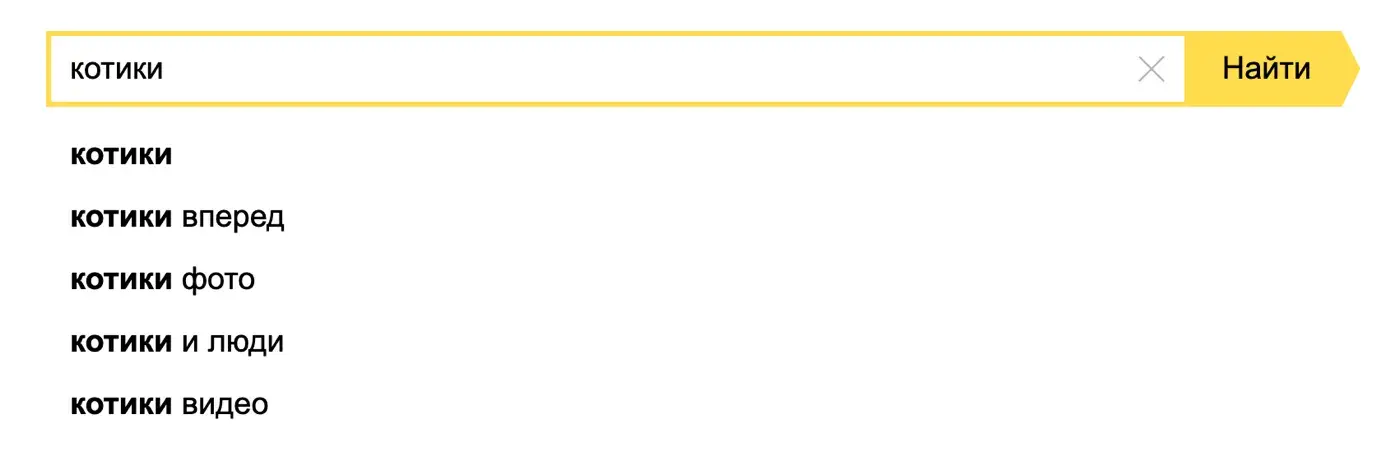 Технология автозаполнения поисковой строки работает по статистике самых популярных запросов. Это очень распространенное дополнение, поэтому его можно встретить на сайте любого поисковика. Варианты подтягиваются из базы данных вертикальным списком — пользователь может выбрать что-то из этого списка, а может и не выбирать. После клика на любой пункт открывается новая страница.