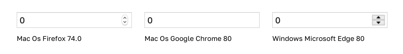 На картинке выше показаны примеры одного и того же поля ввода <input type=”number”> в разных операционных системах и браузерах.