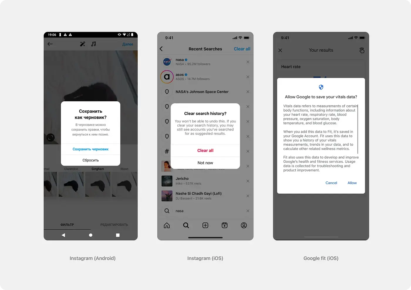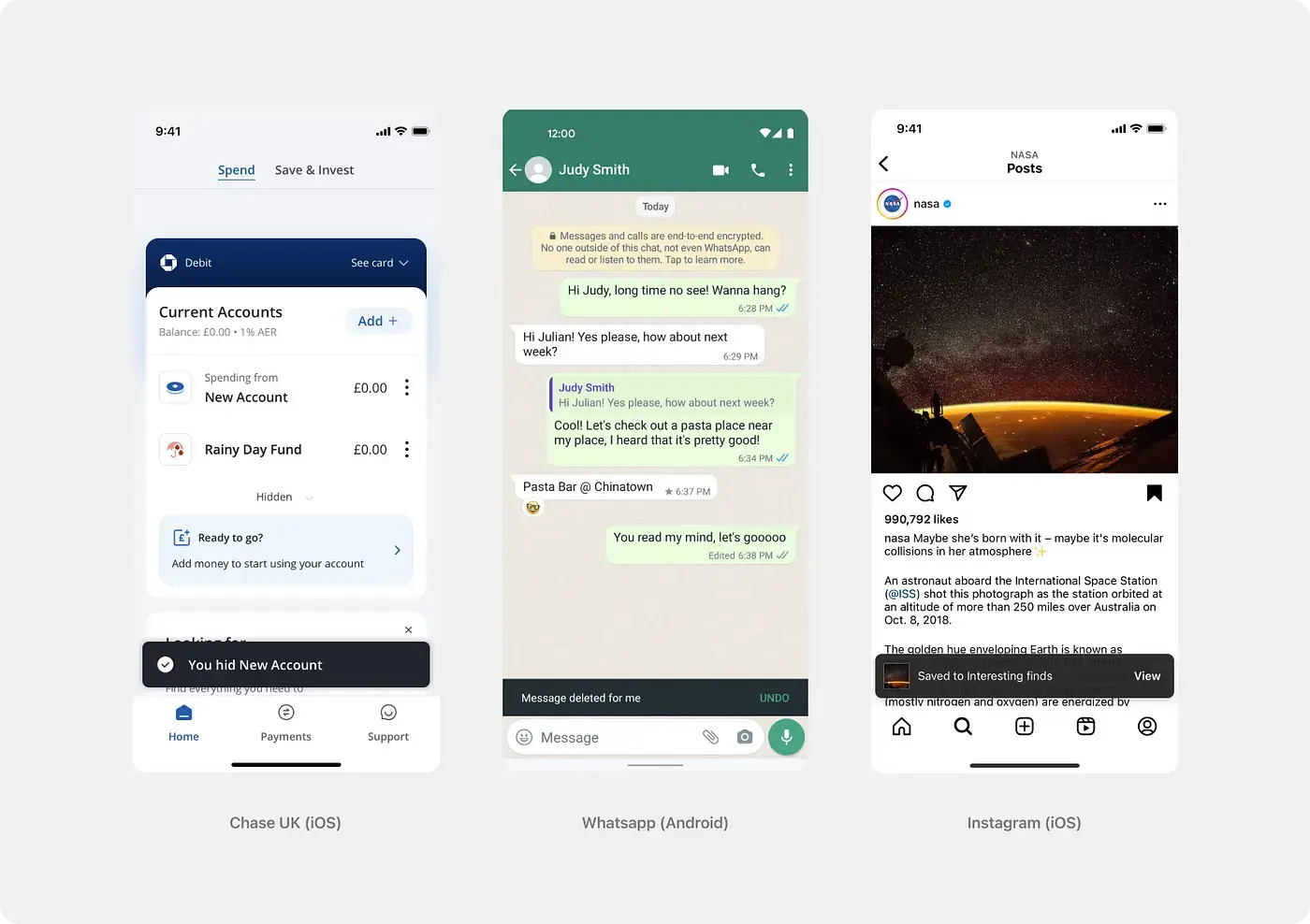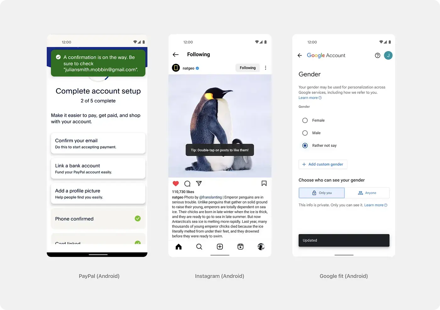 Рассмотрим на примерах. В приложении PayPal Снэкбар показан сверху и той области, где нет важной информации. В приложении Instagram Снэкбар вывели прямо на фото так как взгяд пользователя сфокусирован именно там. А в GoogleFit уведомление об обновлении лучше всего встало внизу экрана.