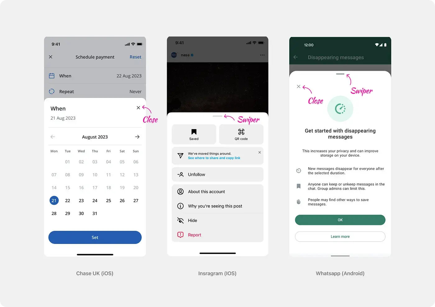 Внимательный читатель мог заметить, что в наших примерах есть различия — где-то в шторе есть крестик, где-то свайпер, где-то кнопка “закрыть”, а иногда можно найти несколько элементов сразу. Дело в том, что на момент 2023 года на рынке нет четкого мнения по этому поводу. Human interface может предложить использовать всё и сразу, а Material Design и вовсе ничего.