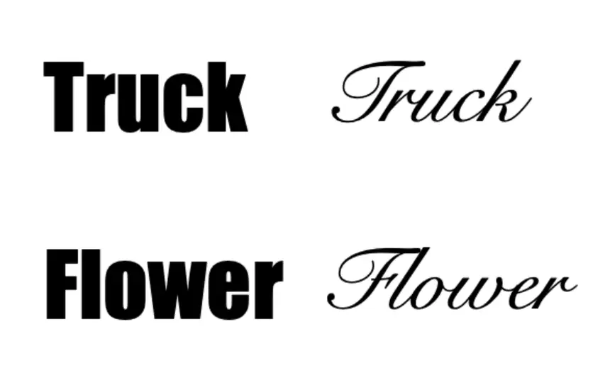 Например, если напечатать слово "truck" массивным шрифтом вроде Impact, вы прочтёте его быстрее, чем если бы оно было набрано изящным шрифтом вроде Snell Roundhand. Однако если этими же двумя шрифтами написать слово "flower", то в шрифте Snell Roundhand вы прочтёте его быстрее.