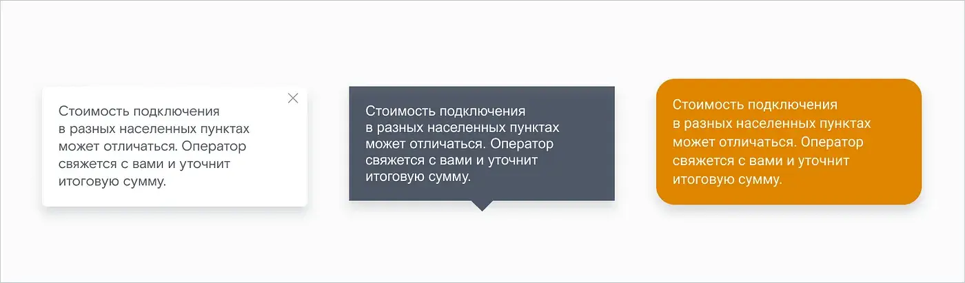 Popover можно кастомизировать: настроить размер и цвет текста, цвет подложки, скругление углов, тень. Popover может содержать уголок, который помогает понять к какому элементу относится подсказка.