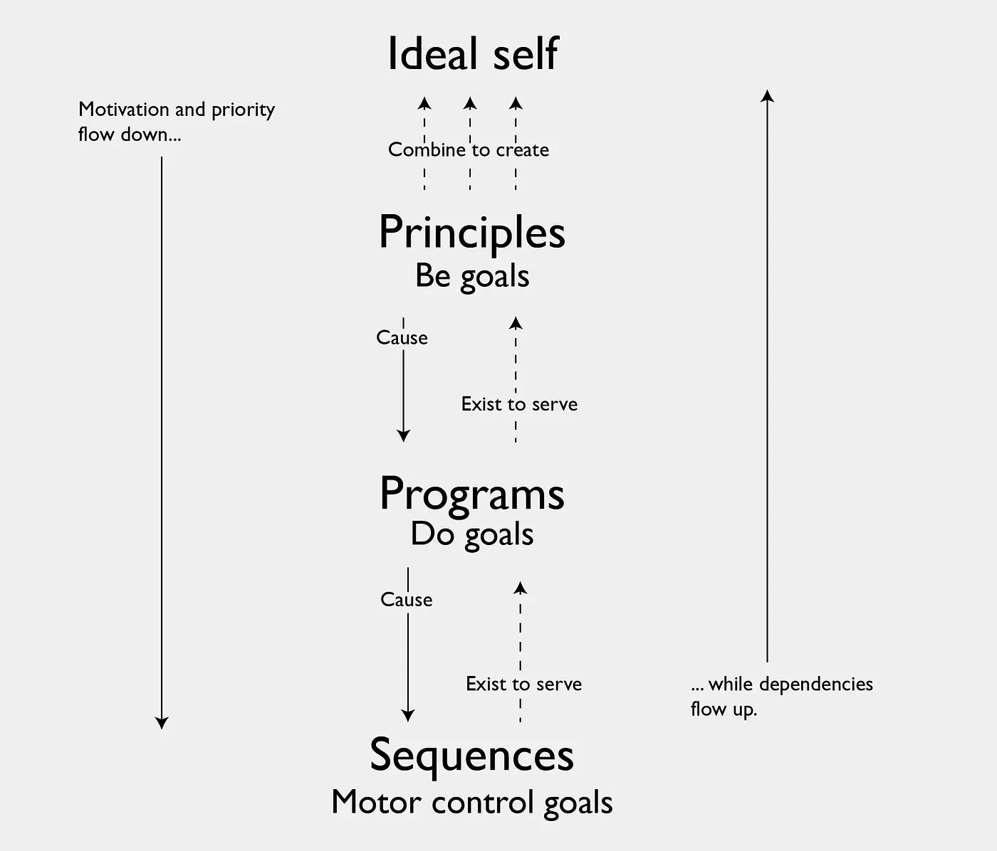 - Приоритетность целей. Цели "Быть" имеют высший приоритет; моторные контрольные цели имеют наименьший приоритет. Цели "Быть" являются основными движущими силами всех наших действий и решений. Это также означает, что независимо от того, насколько хорошо выполнена цель "Делать" или моторная контрольная цель, это будет провалом, если более высокая цель "Быть" не удовлетворена. Также это означает, что для удовлетворения цели "Быть" целью "Делать" не обязательно должно быть успешно исполнено.