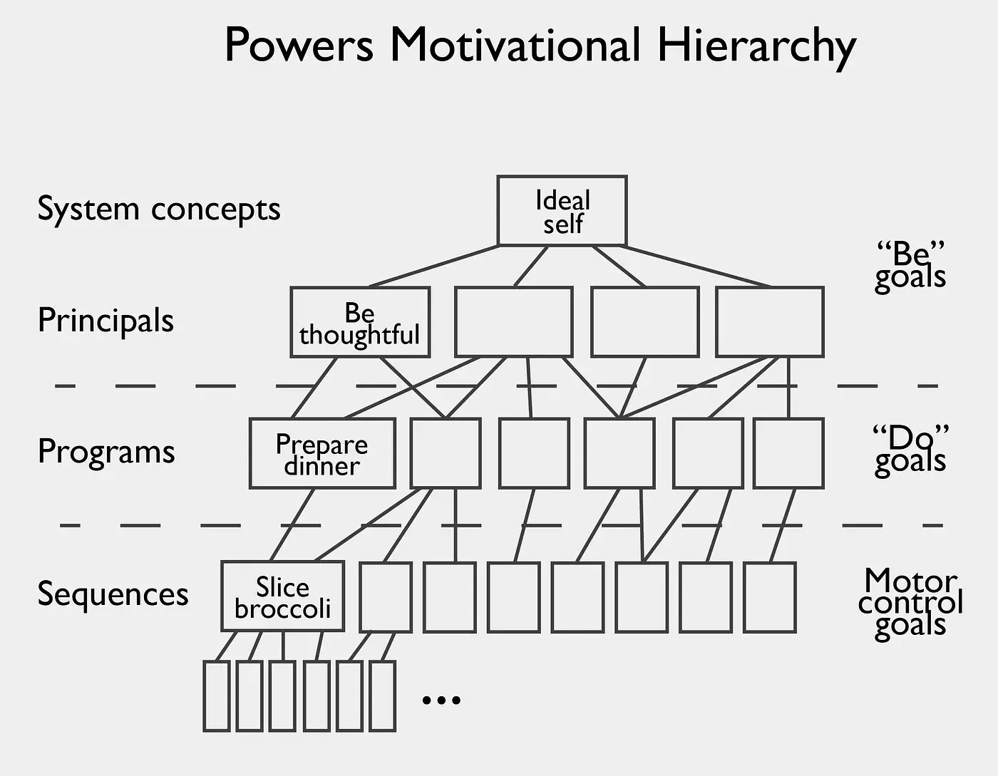 Иерархия целей Уильяма Пауэрса (1973a, 1973b) является широко признанной моделью взаимосвязи между теми действиями, которые мы совершаем, и причинами, по которым мы их совершаем. Эта модель не только помогает понять концепцию "Работа для выполнения", но также способствует пониманию других подходов к дизайну и инновациям.