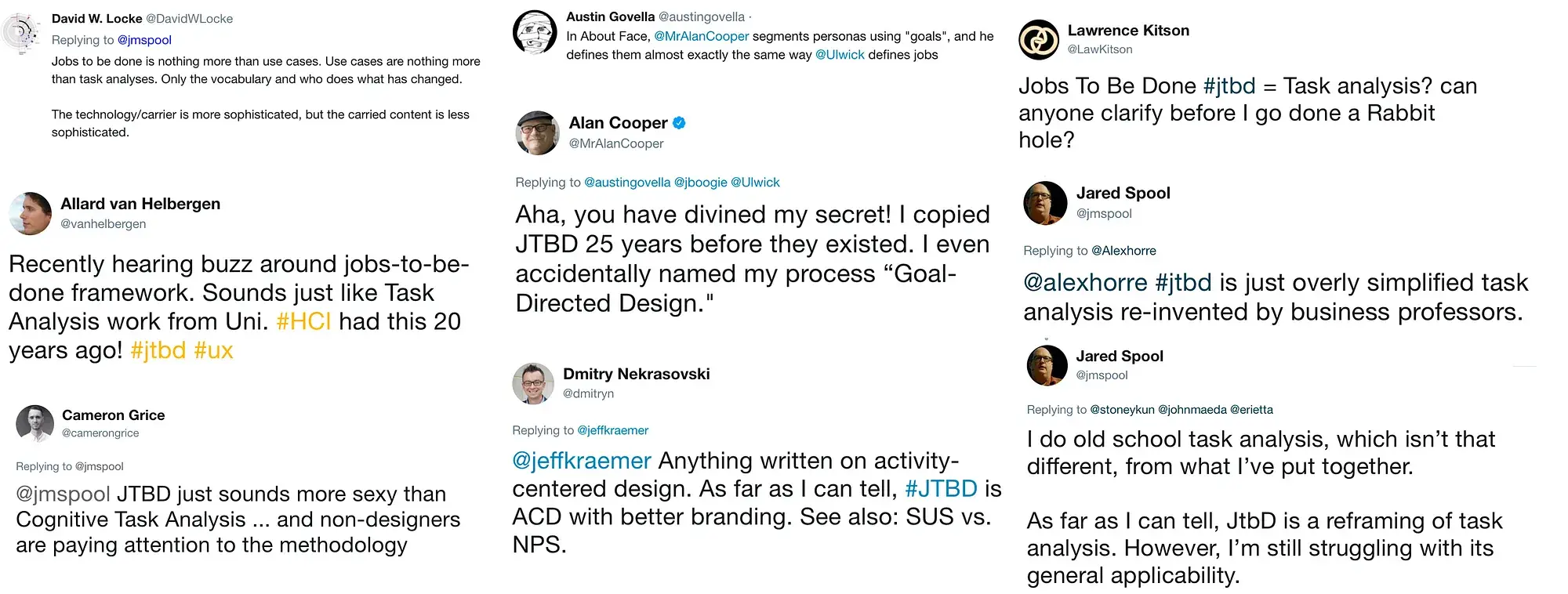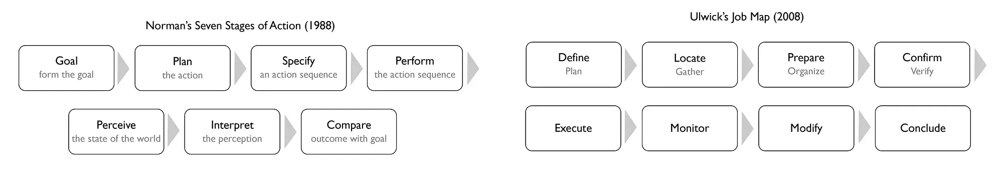 Те, кто имеет опыт в области ориентированного на цель дизайна (Goal-Directed Design), когнитивного анализа задач (Cognitive Task Analysis), иерархического анализа задач (Hierarchical Task Analysis), взаимодействия человека и компьютера (HCI), сценариев использования или дизайна, ориентированного на деятельность, будут признаны, что это толкование JTBD похоже на то, что они уже делают (рисунок 10), и понятие желаемых результатов также схоже с работой Саяна Чаттерджи «Обеспечение желаемых результатов эффективно: творческий ключ к конкурентной стратегии» (Chatterjee 1998)