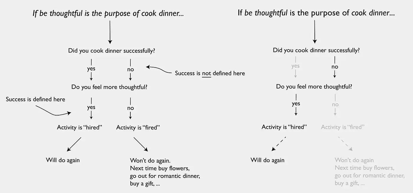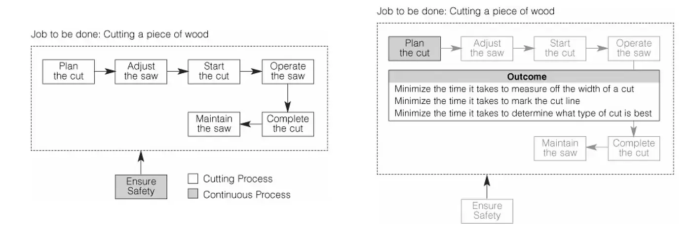 Это различие является критически важным и огромным. В первом случае (Jobs-As-Activities) существует малый или отсутствует интерес к изучению того, почему люди вообще занимаются этой деятельностью! Эта модель начинается с предположения, что, например, «ремесленники хотят нарезать прямую линию».