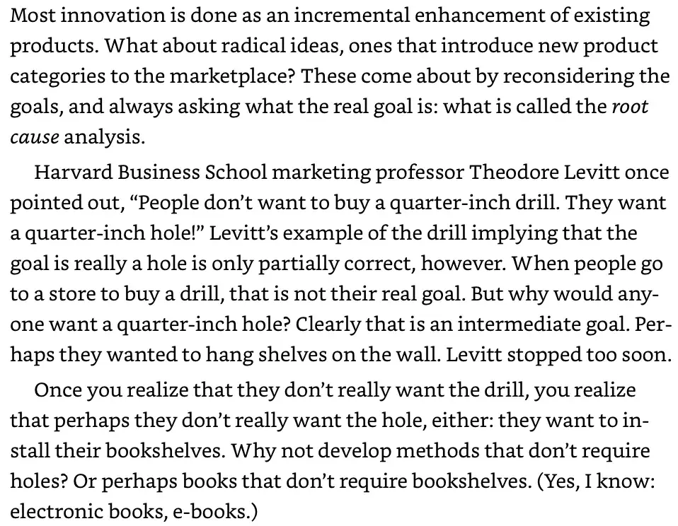 [Маркетинговое воображение] заключается в его подразумевающем предложении о том, что следует делать — в данном случае, выяснить, какие проблемы люди пытаются решить. Это выражается в знаменитой фразе Чарльза Ревсона относительно бизнеса компании Revlon, Inc.: “На фабриках мы производим косметику. В аптечных магазинах мы продаем надежду.” Это также характеризуется известным пояснением Лео Макинвера о том, почему люди покупают сверла диаметром четверть дюйма: “Им не нужны сверла диаметром четверть дюйма. Им нужны отверстия диаметром четверть дюйма.”