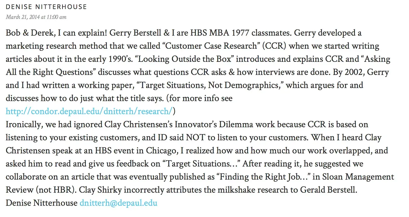 - Путаница в авторских правах. Клай Чатенсен (2017) указывает, что именно Педи и Моеста являются основоположниками мысли о «Работе для клиента», а не Улвик и Ниттерхаус. В то же время, хотя Дениз Ниттерхаус была указана как соавтор статьи «Нахождение правильной работы для вашего продукта» (Christensen et al., 2007), она является сторонником Исследования случаев клиентов (Customer Case Research), что не имеет непосредственного отношения к концепции «Работа, которую нужно выполнить». Более того, комментарий от «Дениз Ниттерхаус» уточняет, что ее ошибочно атрибутировали к известной истории о молочном коктейле (Рисунок 20).