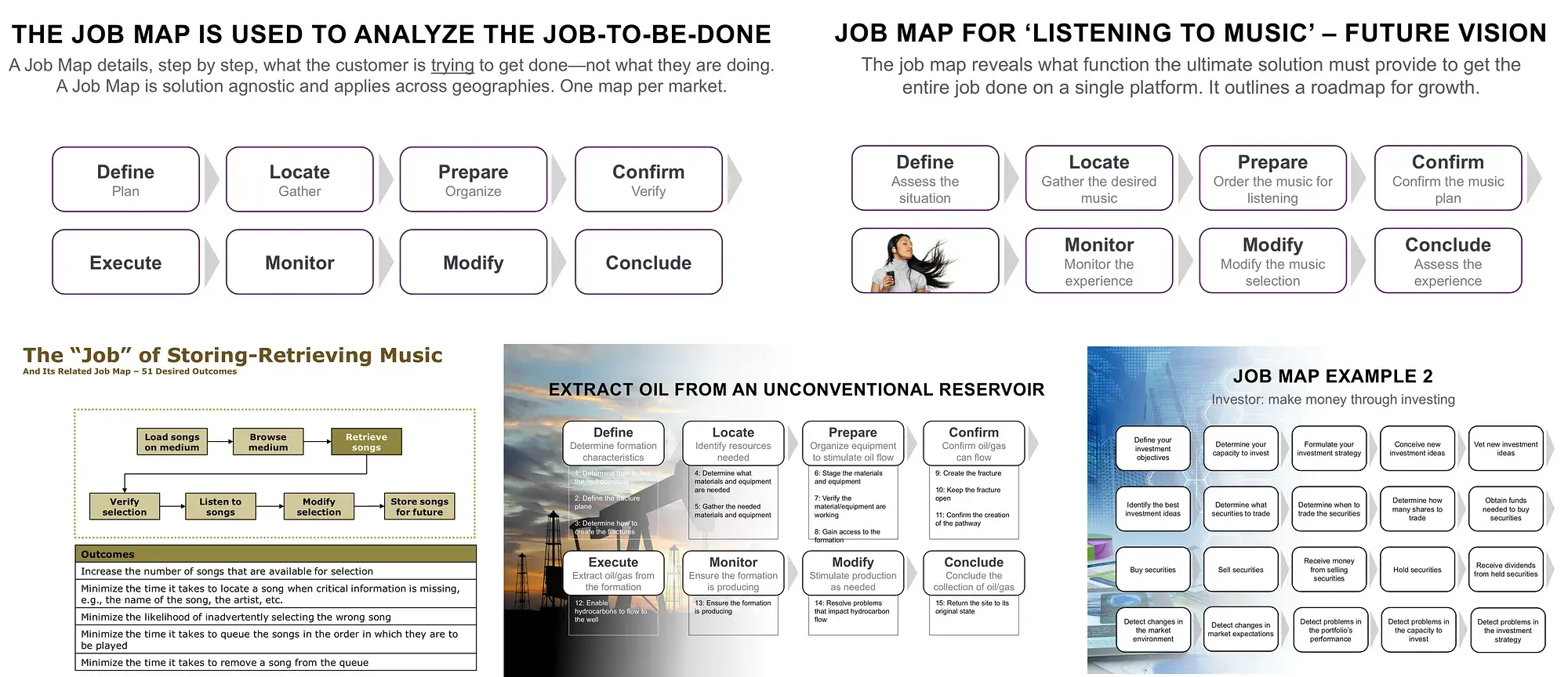 Теория Работы для выполнения предоставляет рамки для (i) категоризации, определения, захвата и организации всех потребностей ваших клиентов, и связи клиентских показателей производительности (в форме заявлений о желаемых результатах) с Работой для выполнения.